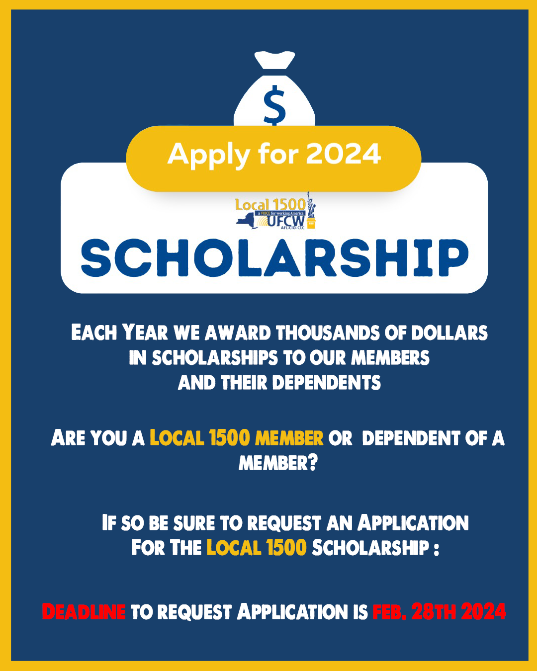 If you are a Local 1500 member or a Dependent. You are eligible to request for an application for the Local 1500 Scholarship. Deadline is February 28th 2024. To Request an Application please visit here: https://www.ufcw1500.org/scholarships/request-online-application/